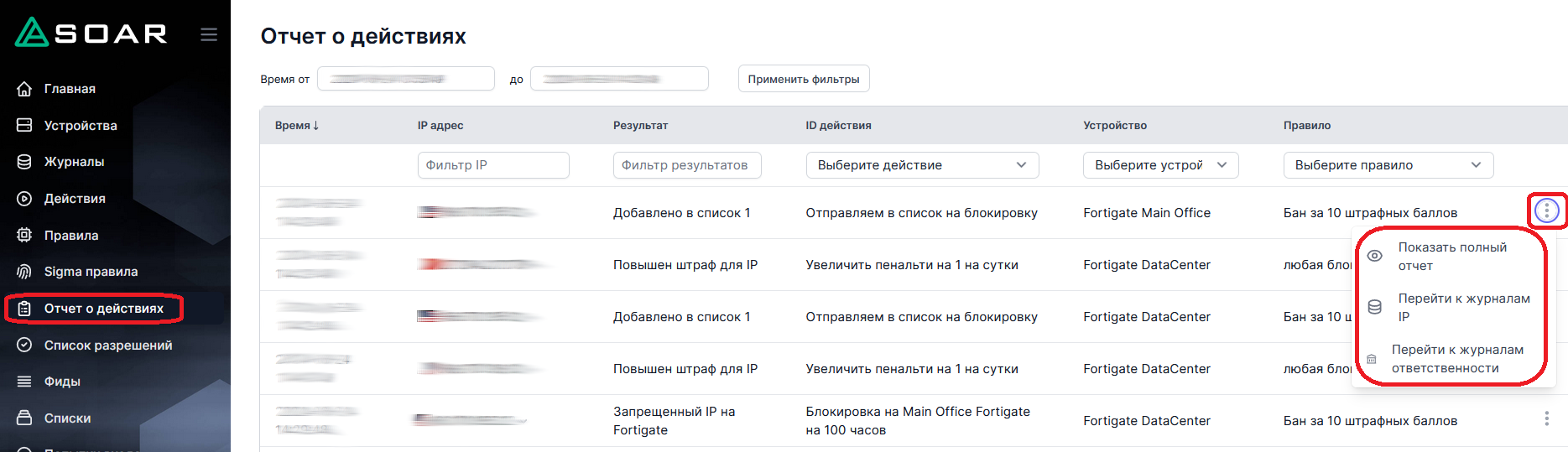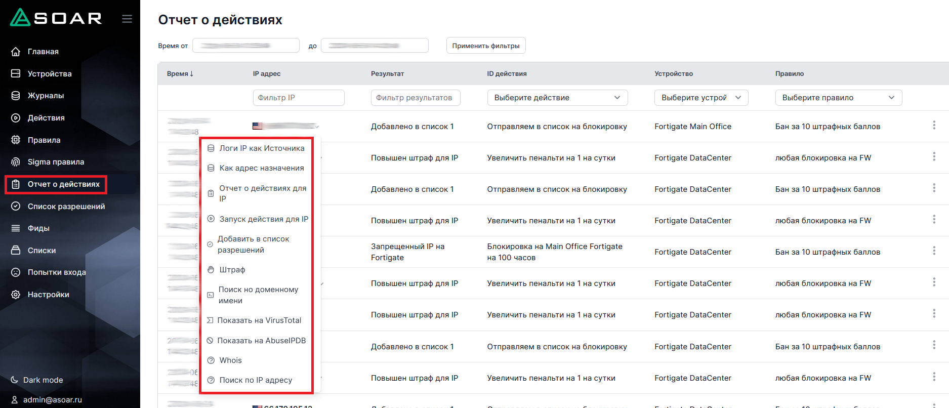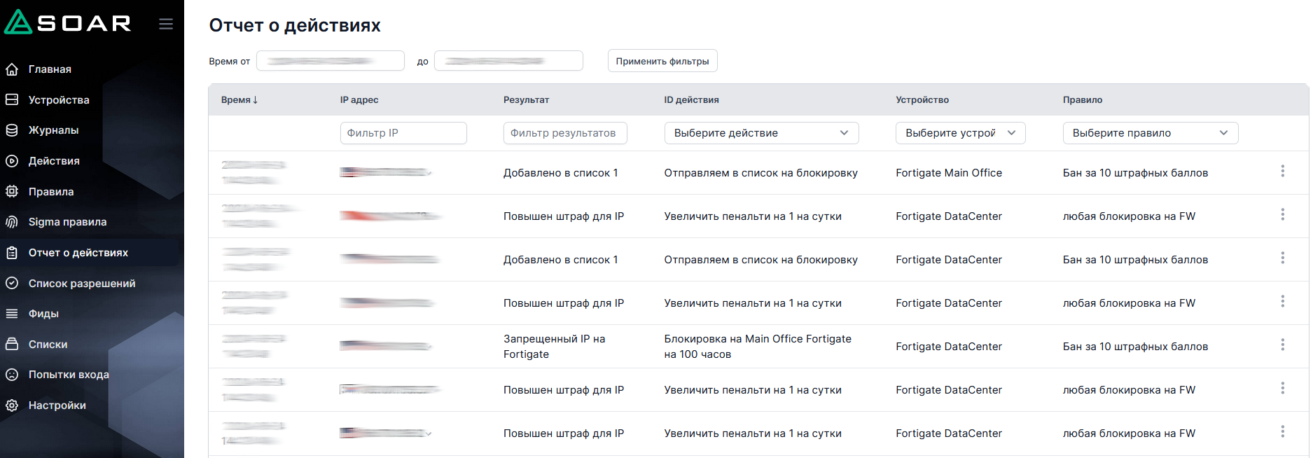 Раздел Отчет о действиях предоставляет подробную информацию о действиях, выполненных на определенных IP-адресах в течение заданного периода времени. Пользователи могут фильтровать и анализировать эти действия по различным критериям, включая IP-адрес, результаты, идентификаторы действий, устройства и правила.