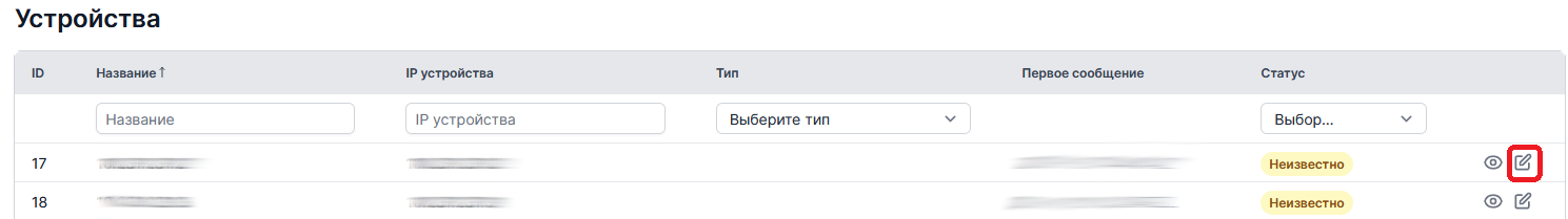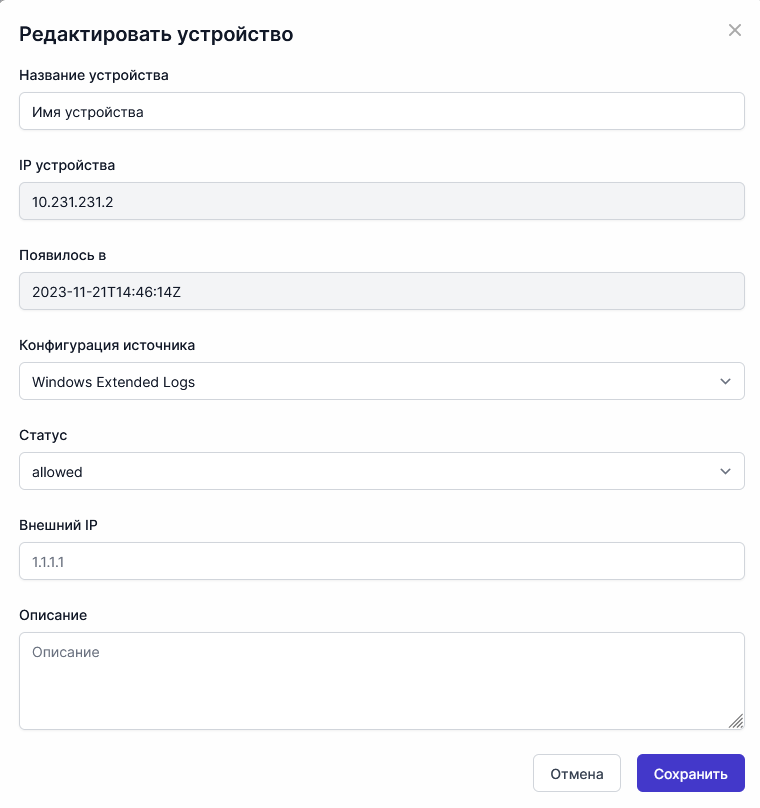 Список устройств, подключенных к Продукту. Все устройства, отправляющие события в Продукт, видны здесь. Каждому устройству в Продукте назначен уникальный IP-адрес.
