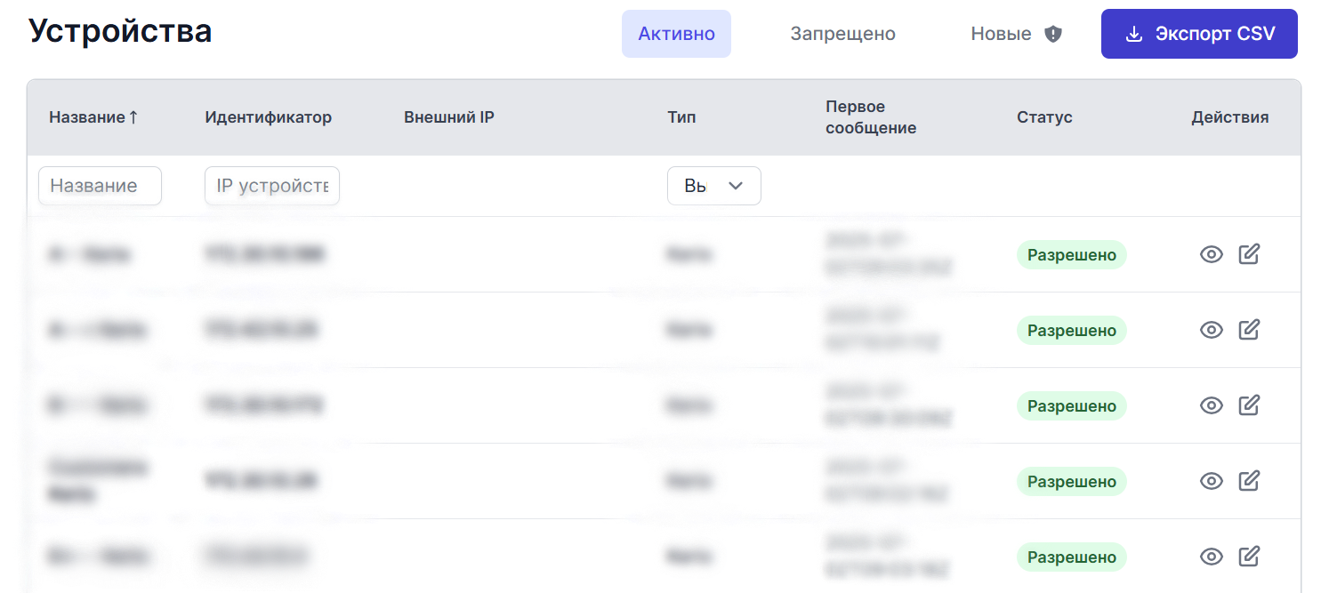 Экспорт CSV-файла активных, запрещённых или новых устройств