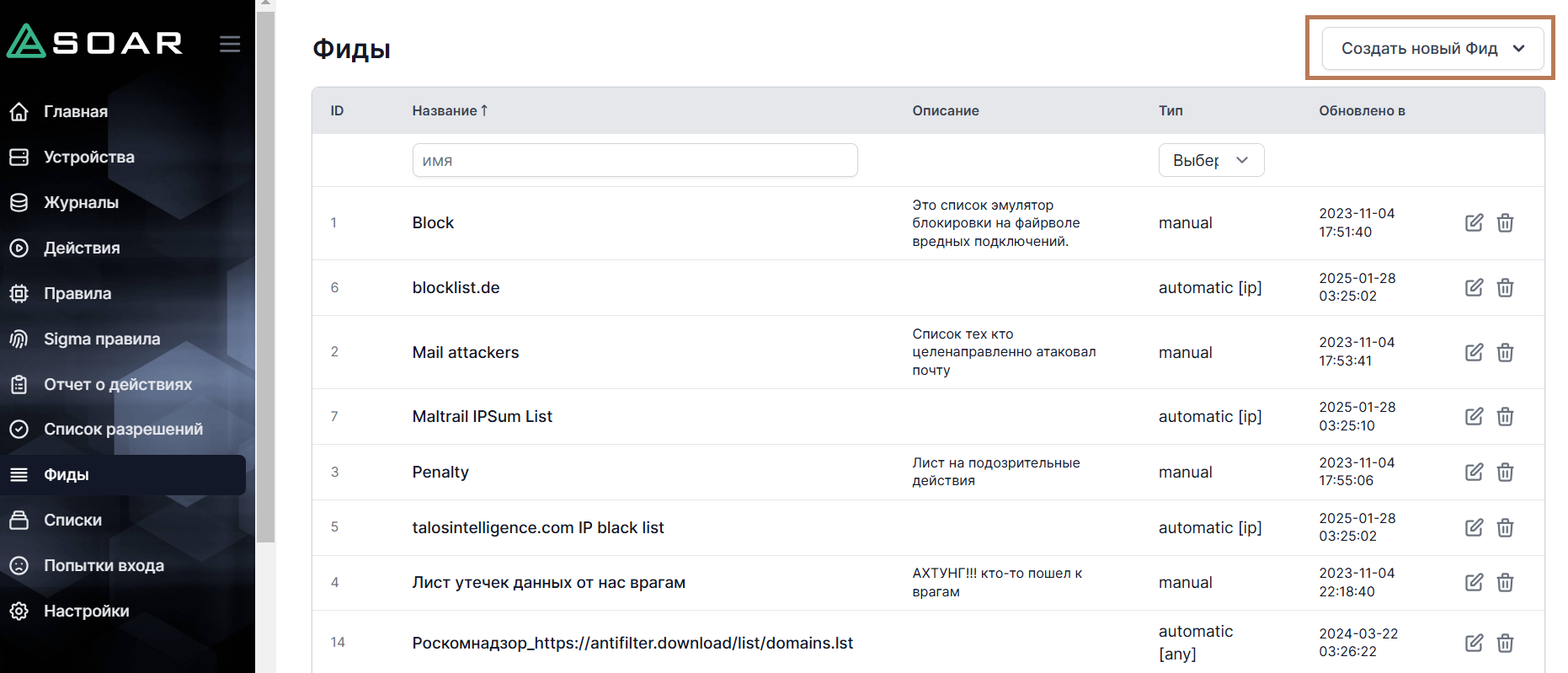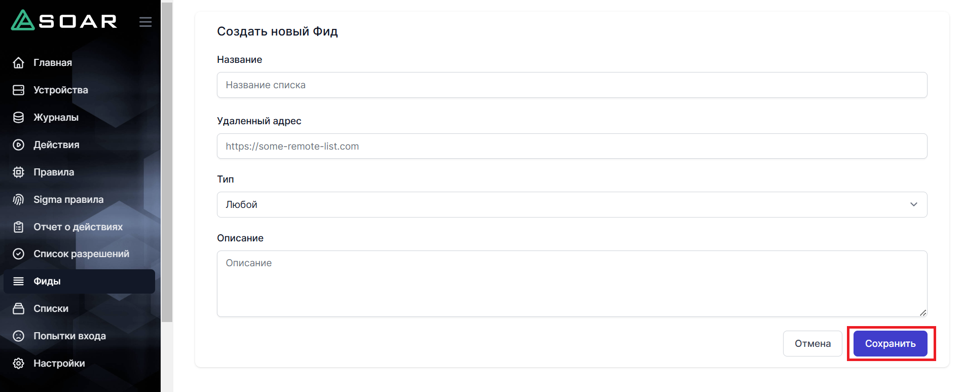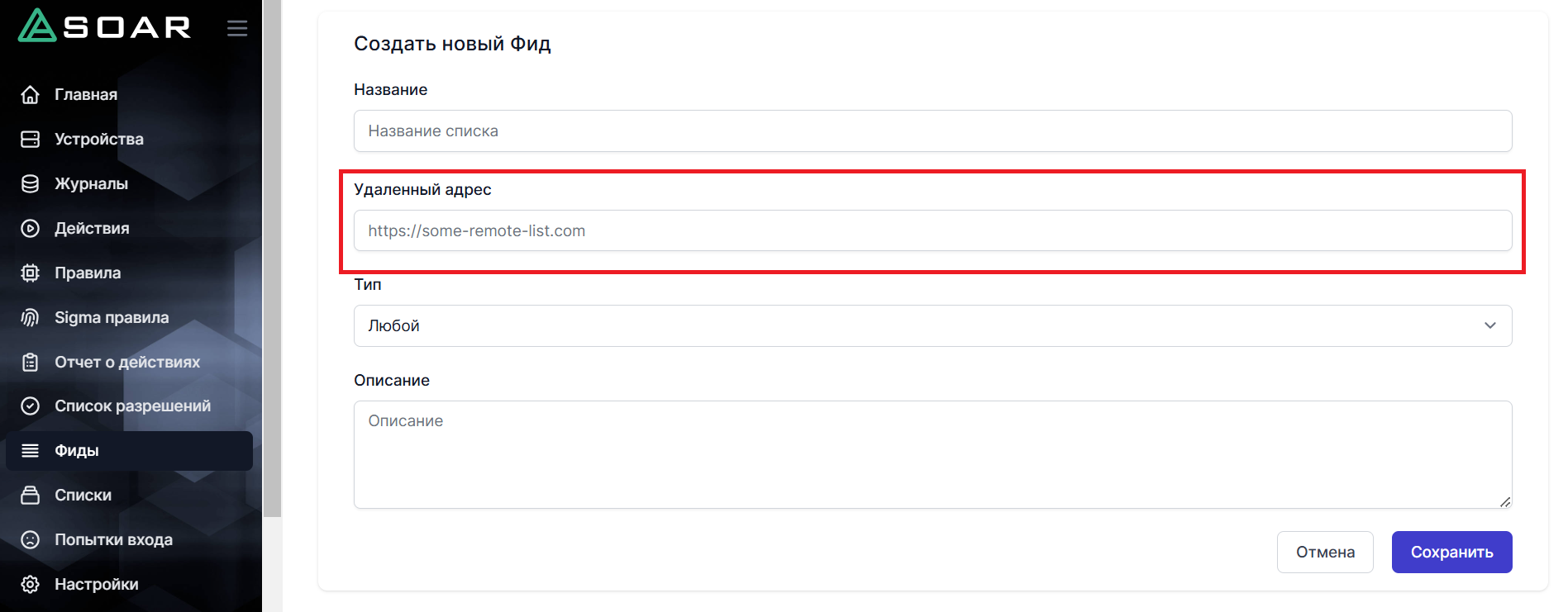 При создании автоматического Фида это означает, что содержимое списка (IP-адреса или другие данные) будет получено из удаленного источника. Поэтому при создании автоматического Фида вам нужно будет предоставить удаленный URL, который будет служить источником информации для этого Фида: