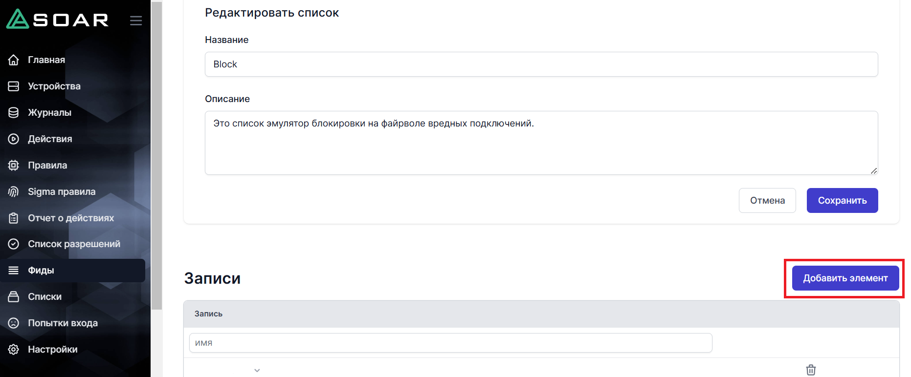 При создании ручного Фида вы можете вручную ввести значения (IP-адрес или любой другой контент в зависимости от выбранного вами типа во время создания Фида).