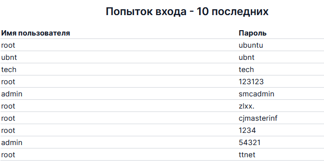 Список имен пользователей и паролей, которые были скомпрометированы или использованы в попытках взлома.