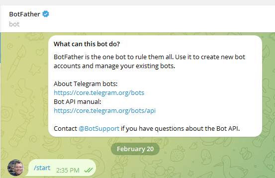 - После успешного создания Telegram-бота вы получите сообщение с токеном для управления ботом.