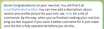- Ответьте на все вопросы о названии и имени пользователя бота корректно (имя пользователя должно заканчиваться на "bot").