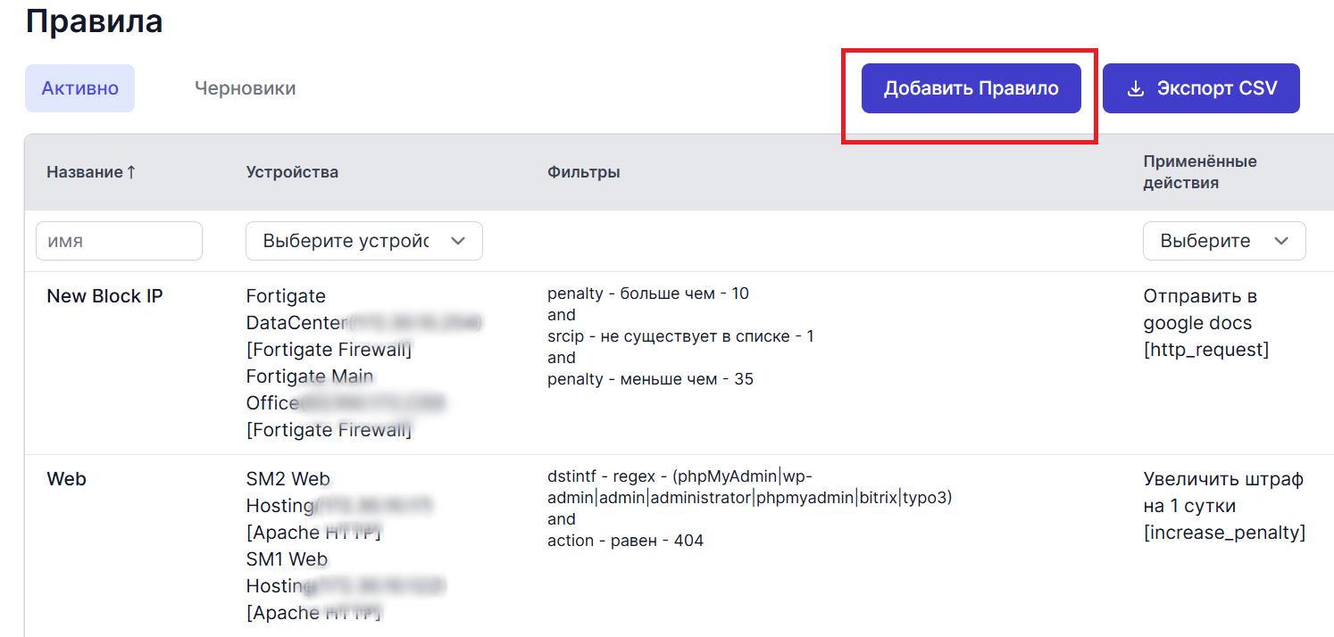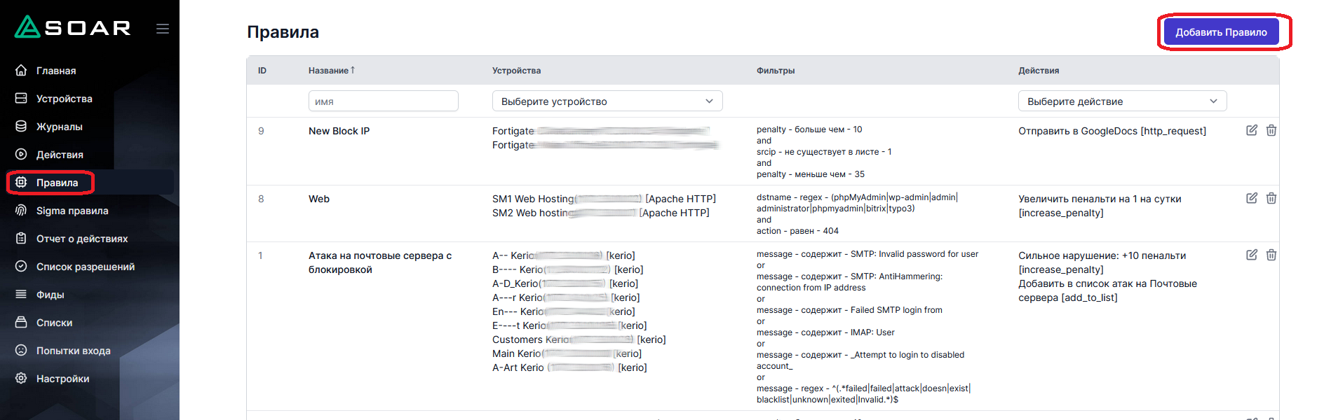 Столбец "Устройства" указывает устройства, к которым применяется правило. Устройства должны быть добавлены заранее, как описано в разделе Добавление нового устройства.
