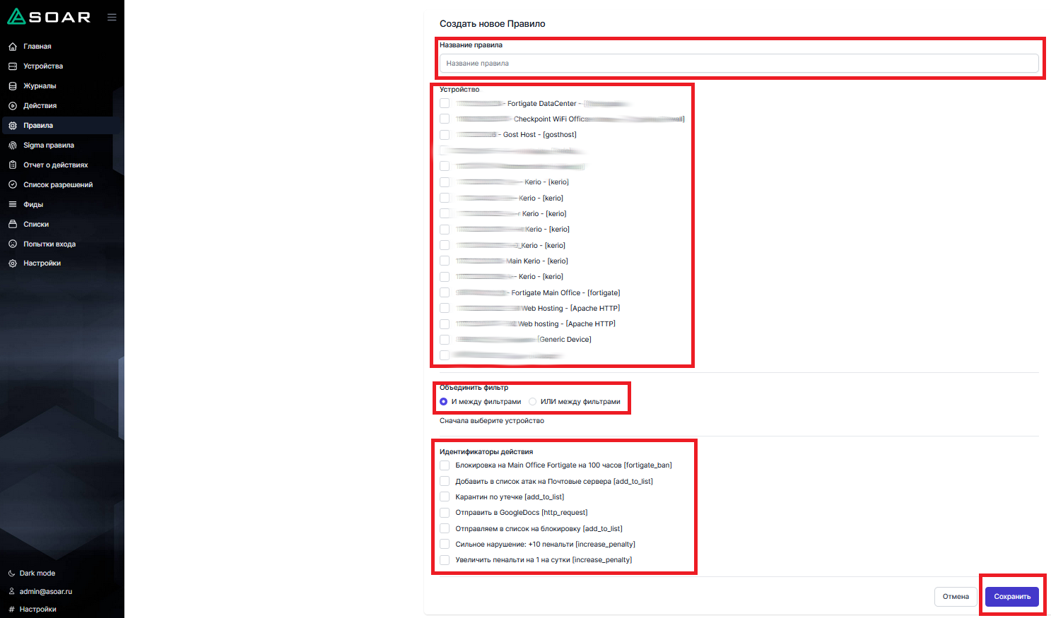 Введите необходимую информацию в соответствующие поля, включая название, устройства, фильтры и действия.
