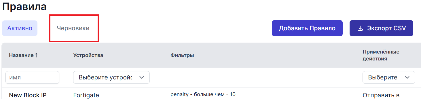 Вы можете просмотреть правила, определённые как черновики, на экране "Правила":